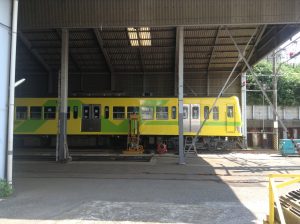 車庫横から覗いたもの。当時は営業運転に供するための整備中でありました。西武から譲渡されて間もない頃と記憶してます。