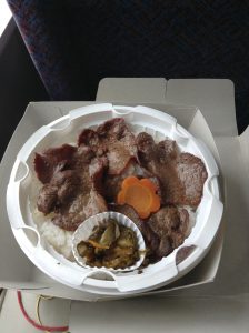 中身はこんな感じ。麦飯の上に牛たんがのっています。一応漬け物もあります。