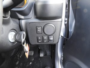 まず、エンジンをかけるときは従来のキーを差し込んでエンジンをかける仕組みになっています。最近は、キーレスタイプが主流になってきていますが、キーレスになれない高齢者の方にとってはうってつけなのかもしれません。(写真の中央部にある丸いものがキーレスタイプ用のエンジン起動スイッチが入るところだそうです。たぶん、ミライースの中でもグレードが高いやつがキーレスタイプを採用しているのでしょう)