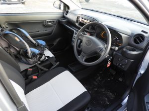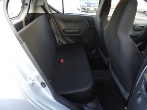 そして後部座席がこちら。運転席周りに比べるとやっつけ感というか、チープさが否めないつくりになってしまっている。軽自動車だし、そこらへんは止むなしなのではあるのだろうけれども、もう少し何とかならなかったのかなあとも思った次第である。(なお、ミライースのグレードの高いものは後部座席にもヘッドレストはついてますが、そもそも主目的が通勤用に使うというのもあって今回廉価版にしたというのも一因としてはあると思います)