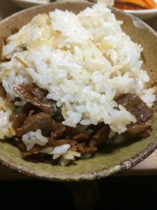 そして混ぜご飯のアップ。きちんと刻み生姜も入ってます。時雨蛤混ぜご飯おいしかったです。こんな高級な混ぜご飯は死ぬまで食えないんじゃないかと思います。はい。