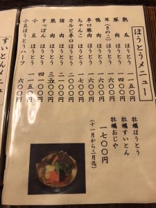 さて、一番最初に書いてある熟瓜ほうとう(かぼちゃほうとう)が、いわゆるほうとうのスタンダード的な位置にあるものです。