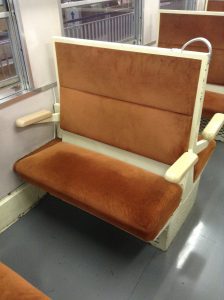 座席を撮ってみました。登場当初はリクライニングシートなどという文明的なものは存在しておらず、このようなリクライニングしないクロスシートが主流でありました。座席を転換するにも腰掛下にペダルなんてものは存在しておらず、座席の背もたれを後ろからおして回転させるのが、当時の座席の回転方法でありました。