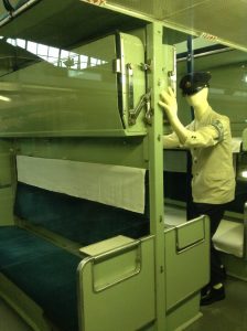 どの車両か失念しましたが、寝台列車内の車内を外からとりました。昔、寝台特急が多かった時代は寝台状態から座席状態にするために、朝からボーイが寝台をたたむ作業がよく見られました。