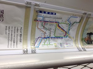 国鉄101系電車内にあった路線図です。いわゆる首都圏の国電区間のみの掲載となっております。今の路線図と比べて色使い(山手線・中央総武線各駅停車・中央線快速・京浜東北線・根岸線・常磐線は同一)が違ってたり、根岸線の洋光台~大船間が未開通だったり、国分寺からは中央線の支線(下河原線。現在は廃線)が残ってたりと、路線図ファンにはたまらないのではないでしょうか。また、この写真を見る限り地下鉄千代田線も霞ヶ関から先は未開通のようです。