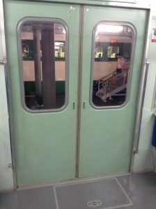 国鉄101系電車のドアです。昔はこんな感じでドアの内側も塗装されておりました。現在の電車ですと無塗装ないしは、化粧板を貼っている形式が主流になっています。現代っこには違和感を覚えるでしょうが、中年以上の世代は懐かしさを感じるのではないでしょうか?