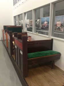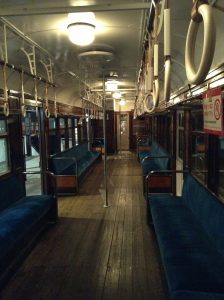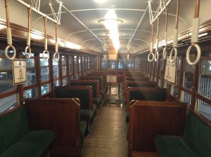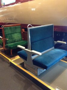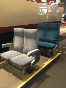 ここにも座席が展示されていました。古いものはベンチみたいな形だったり、背もたれにモケットが入っていなかったりしていることがわかると思います。