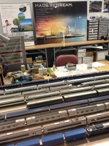 ジオラマの近くにあった模型製作スペースです。いろんな車両がいました。