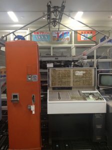 この写真の左にあるのが、初期の自動券売機です。おそらく初乗り運賃のみの対応だと思われます、自動券売機の横にある機械が、いわゆる「マルス」と呼ばれているもので、今のみどりの窓口においてある全国のJR券(当時は国鉄線)が発券できる機械です。それらの後ろにパンタグラフが展示されております。