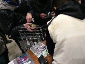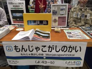 前回のもんじゃ焦がしの会は、2日目の西1よ43-bにて展開されました。机上には、今はなき拝島快速拝島行きの幕が皆様をお出迎えしておりました。