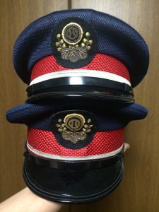 左側は、小さい駅(助役・駅長無配置駅)の当務駅長がかぶる制帽(2種類)、右側が一般職員(線が入る役職ではない職員)がかぶる制帽です。この3つを展示します。なお、時間帯によっては、わいがかぶってお出かけする場合もあるため、一時的に2種類になっていることもあります。その際は、ご容赦ください。