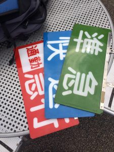 最後のトリ(?)は、一昔前の西武鉄道の必携品であった種別板です。写真に掲載されている「通勤急行」・「快速」・「準急」に「急行」を加えて、4種類の種別板を展示いたします。