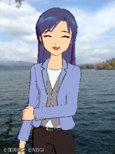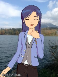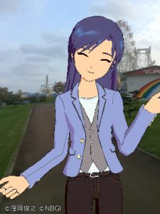 「ファミリー愛ランドYOU」をバックに千早を撮る。