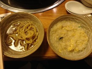 〆は雑炊とラーメンで。ちゃんこのスープの味を活かすため、わいのグループで雑炊をつくり、もう一方のグループでラーメンをつくり、皆で分け合って食べた。
