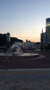 夕闇の鳥羽駅を佐田浜東公園から撮影する。この佐田浜東公園には噴水のほか、足湯も設置されていたりする。