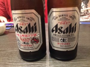 まずは、各々好きな酒で1杯。とりあえずビールを注文したところを撮影。アサヒビールのラベルが左右で異なっており、右が普通のバージョンで、左がご当地バージョンとなっている。