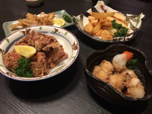 そして、おつまみの登場。とりあえず4種類。揚げ物系が多いのはご愛敬。