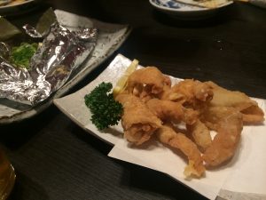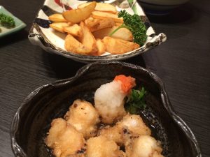 ポテトフライとタコの唐揚げ。ポテトは界隈問わず大人気のおつまみ。タコの唐揚げも地物のタコを使ってるので、真においしゅうございました。