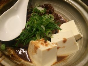 こちらは牛筋の煮込み。牛筋はおいしい。煮込みとか最高すぎますわ。また、ネギとの相性も抜群でしたよ本当に。