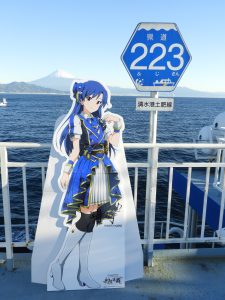 船上でやりたかった芸を実際に敢行。富士山と千早POPを絡めた写真撮影だ。やっぱり後部のデッキにほとんど人がいなかったからこそできた芸当である。まあ、いてもやりましたけどね。これが、一つのミッションでしたし。