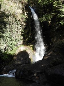 6番目の滝は、出合滝。2つの流れ(本谷川と荻ノ入川)がここで出合ってひとすじの流れになることから名付けられたらしい。流れ込む水の青さが印象的な滝だそうですが、当日はそこまで青くなかった感じがしました。たまたまそうだったのかもしれないが・・・。