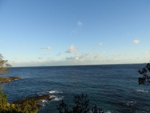 龍宮窟の上に行く遊歩道から海を眺める。遠くに見える島影は、左から利島・新島・式根島・神津島となっている。どれがどの島かわかっただろうか?(拡大するとよくわかります)