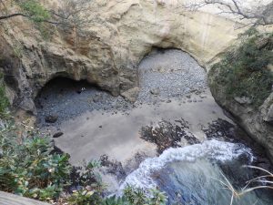 ここはおおきな海食洞の天井が一部崩れて、直径50メートルほどの天窓が開いたもので、龍宮窟の天窓は伊豆の各地にあるものの中でも最大級であり、道路沿いの入口から洞窟を通って天窓の下に立つこともできるらしいとか。