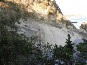 これは、田牛サンドスキー場という珍しいスキー場で、砂のスキー場になっているというわけである。なお、人工で作られたものではなくて海岸に溜った砂が強風により崖に吹き付けられて積み上がり、砂の斜面となったという自然が成した業というのだから驚きである。