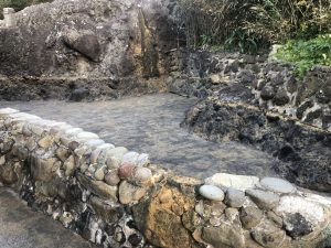 人がいないタイミングを見計らって撮影した磯の湯の様子がこちら。脱衣所と露天風呂という簡素なつくりになっており、湯舟は6~7名くらいはいれる分のスペースがあるくらいだ。