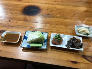 お通し各種の左側にあるのが、味噌ダレになります。「厚木シロコロ・ホルモン」を提供しているお店では店ごとにオリジナルのタレがあるのが特徴となっていますが、大半は味噌ダレが主流とのことです。