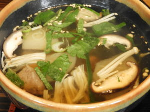 神戸牛牛すじスープのアップです。スープの中には牛すじのほか、ねぎや大根、人参、えのき、しいたけなど具材がなかなかヘルシーなもので構成されています。具が結構多かったのが印象的でした。