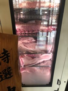 客席入り口付近には、神戸牛の肉の塊が置かれている冷蔵庫があり、スライスされる前の神戸牛(畜解体された後の神戸牛)のさまをみることができます。