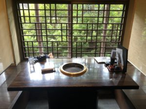 席の部分のアップです。靴を脱いであがる形式になっています。テーブルの下が掘りごたつになっているのがお分かりいただけるでしょうか?